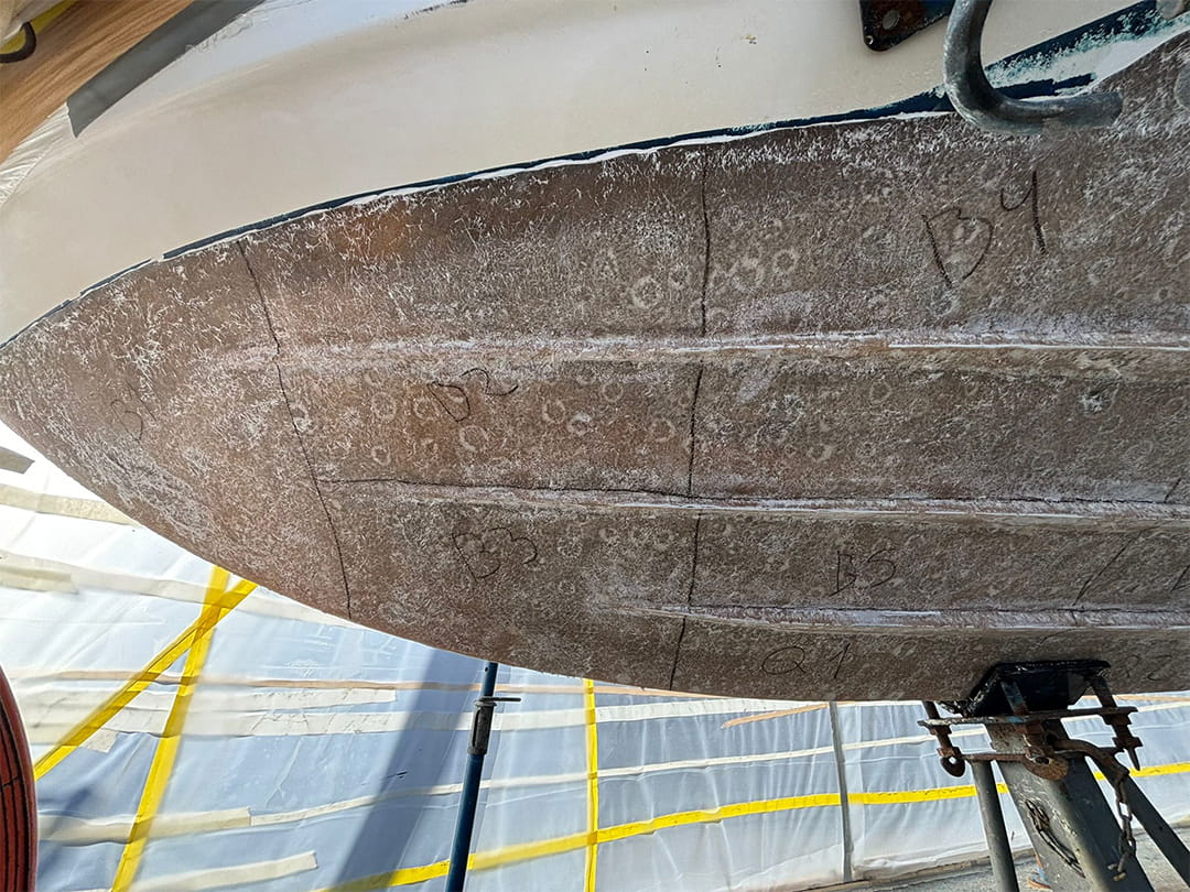 - Stripping and removal of damaged gelcoat: We remove the antifouling and carefully peel the hull until reaching the healthy structural laminate.